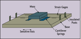 Mechanical accelerometers, such as the seismic mass accelerometer, velocity sensor, and the mechanical magnetic switch, detect the force imposed on a mass when acceleration occurs. The mass resists the force of acceleration and thereby causes a deflection or a physical displacement, which can be measured by proximity detectors or strain gages (Figure 6-3). Many of these sensors are equipped with dampening devices such as springs or magnets to prevent oscillation.