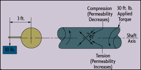 The ability of a shaft material to concentrate magnetic flux--magnetic permeability--also varies with torque and can be measured using a magnetostrictive sensor. When the shaft has no loading, its permeability is uniform. Under torsion, permeability and the number of flux lines increase in proportion to torque. This type of sensor can be mounted to the side of the shaft using two primary and two secondary windings. Alternatively, it can be arranged with many primary and secondary windings on a ring around the shaft.