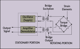 A strain gage can be installed directly on a shaft. Because the shaft is rotating, the torque sensor can be connected to its power source and signal conditioning electronics via a slip ring. The strain gage also can be connected via a transformer, eliminating the need for high maintenance slip rings. The excitation voltage for the strain gage is inductively coupled, and the strain gage output is converted to a modulated pulse frequency (Figure 6-5). Maximum speed of such an arrangement is 15,000 rpm.