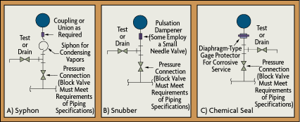 Two common reasons for gauge (and switch) failure are pipe vibration and water condensation, which in colder climates can freeze and damage the gauge housing. Figure 5-1 illustrates the design of both a traditional and a more reliable, "filled" pressure gauge. The delicate links, pivots, and pinions of a traditional gauge are sensitive to both condensation and vibration. The life of the filled gauge is longer, not only because it has fewer moving parts, but because its housing is filled with a viscous oil. This oil filling is beneficial not only because it dampens pointer vibration, but also because it leaves no room for humid ambient air to enter. As a result, water cannot condense and accumulate.