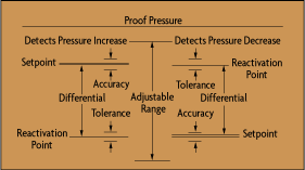 Figure 5-3 illustrates the terminology used to describe pressure switch functionality and performance. When the pressure reaches the setpoint (which is adjustable within the range), the switch signals an "abnormal condition" and it does not return to "normal" (the reactivation point) until the pressure moves away from the abnormal condition by the "differential" (also called dead-band). The precision of setpoint actuation is called its "accuracy," while the precision of reactivation is called "tolerance."