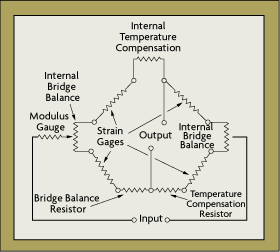 Strain-gage load cells convert the load acting on them into electrical signals. The gauges themselves are bonded onto a beam or structural member that deforms when weight is applied. In most cases, four strain gages are used to obtain maximum sensitivity and temperature compensation. Two of the gauges are usually in tension, and two in compression, and are wired with compensation adjustments as shown in Figure 7-2. When weight is applied, the strain changes the electrical resistance of the gauges in proportion to the load.