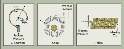 A Bourdon tube is C-shaped and has an oval cross-section with one end of the tube connected to the process pressure (Figure 3-1A). The other end is sealed and connected to the pointer or transmitter mechanism. To increase their sensitivity, Bourdon tube elements can be extended into spirals or helical coils (Figures 3-1B and 3-1C). This increases their effective angular length and therefore increases the movement at their tip, which in turn increases the resolution of the transducer.
