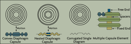 The family of flexible pressure sensor elements also includes the bellows and the diaphragms (Figure 3-2). Diaphragms are popular because they require less space and because the motion (or force) they produce is sufficient for operating electronic transducers. They also are available in a wide range of materials for corrosive service applications.