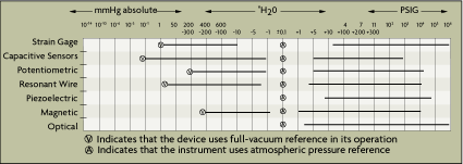 Figure 3-3 provides an overall orientation to the scientist or engineer who might be faced with the task of selecting a pressure detector from among the many designs available. This table shows the ranges of pressures and vacuums that various sensor types are capable of detecting and the types of internal references (vacuum or atmospheric pressure) used, if any.