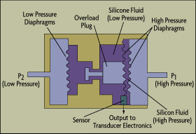 Strain-gage transducers are used for narrow-span pressure and for differential pressure measurements. Essentially, the strain gage is used to measure the displacement of an elastic diaphragm due to a difference in pressure across the diaphragm. These devices can detect gauge pressure if the low pressure port is left open to the atmosphere or differential pressure if connected to two process pressures. If the low pressure side is a sealed vacuum reference, the transmitter will act as an absolute pressure transmitter.
