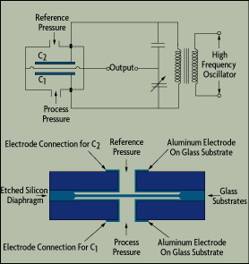 In a capacitance-type pressure sensor, a high-frequency, high-voltage oscillator is used to charge the sensing electrode elements. In a two-plate capacitor sensor design, the movement of the diaphragm between the plates is detected as an indication of the changes in process pressure.