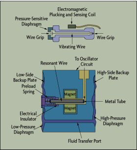 The resonant-wire pressure transducer was introduced in the late 1970s. In this design (Figure 3-7), a wire is gripped by a static member at one end, and by the sensing diaphragm at the other. An oscillator circuit causes the wire to oscillate at its resonant frequency. A change in process pressure changes the wire tension, which in turn changes the resonant frequency of the wire. A digital counter circuit detects the shift. Because this change in frequency can be detected quite precisely, this type of transducer can be used for low differential pressure applications as well as to detect absolute and gauge pressures.