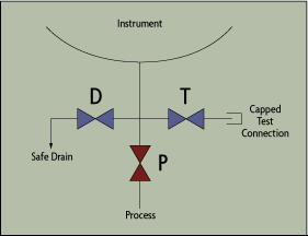 A three-way manifold (Figure 3-13) can provide such protection. In the illustration, valve P is used to isolate the process and valve D serves to discharge the trapped process fluid from the instrument into some safe containment. The purpose of valve T is to allow the application of a known calibration or test pressure to the instrument. As all the components of the manifold are pre-assembled into a compact package, space and field assembly time are saved and chances for leaks are reduced.