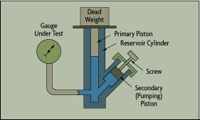 A deadweight tester consists of a pumping piston with a screw that presses it into the reservoir, a primary piston that carries the dead weight, and the gauge or transducer to be tested (Figure 3-14). It works by loading the primary piston (of cross sectional area A), with the amount of weight (W) that corresponds to the desired calibration pressure (P = W/A). The pumping piston then pressurizes the whole system by pressing more fluid into the reservoir cylinder, until the dead weight lifts off its support.