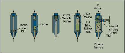 The first design shown in the illustration uses a corrosion-resistant porous metal filter to delay the pressure reading by about 10 seconds. Other designs provide shorter delays via fixed or variable pistons or restrictions. The advantage of an adjustable restriction is that if, for example, a pressure gauge is placed on the discharge of a compressor, one can see when the pointer cycling has stopped. Naturally, when one is interested in the measurement of fast, transient pressures (such as to initiate safety interlocks on rising pressures), snubbers must not be used, as they delay the response of the safety system.