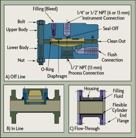 The chemical seal is also known as a "diaphragm protector." Its main components (the upper and lower body and the clean-out ring) are shown in Figure 3-16A. The pressure instrument is screwed into the upper body, which can be made of standard materials because it contacts only the non-corrosive filling fluid, usually a silicone oil. The top section with the filled diaphragm capsule can be removed with the pressure instrument while the operator cleans out the material accumulated in the bottom housing. This lower body is made of "pipe specification" (process compatible) materials and can be continuously or periodically cleaned by purging.