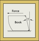 Shearing strain considers the angular distortion of an object under stress. Imagine that a horizontal force is acting on the top right corner of a thick book on a table, forcing the book to become somewhat trapezoidal (Figure 2-2). The shearing strain in this case can be expressed as the angular change in radians between the vertical y-axis and the new position. The shearing strain is the tangent of this angle.