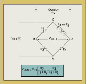 The sensor, however, can occupy one, two, or four arms of the bridge, depending on the application. The total strain, or output voltage of the circuit (VOUT) is equivalent to the difference between the voltage drop across R1 and R4, or Rg. This can also be written as: