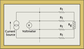 The four-wire circuit is also suitable for automatic voltage offset compensation. The voltage is first measured when there is no current flow. This measured value is then subtracted from the voltage reading when current is flowing. The resulting voltage difference is then used to compute the gage resistance. Because of their sensitivity, four-wire strain gages are typically used to measure low frequency dynamic strains. When measuring higher frequency strains, the bridge output needs to be amplified. The same circuit also can be used with a semiconductor strain-gage sensor and high speed digital voltmeter. If the DVM sensitivity is 100 microvolts, the current source is 0.44 milliamperes, the strain-gage element resistance is 350 ohms and its gage factor is 100, the resolution of the measurement will be 6 microstrains.