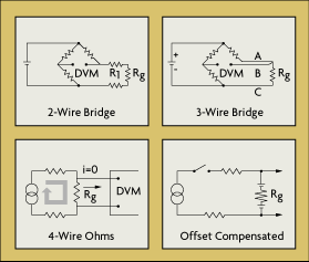 Although the Wheatstone bridge is one of the most popular methods of measuring electrical resistance, other methods can also be used. The main advantage of a four-wire ohm circuit is that the lead wires do not affect the measurement because the voltage is detected directly across the strain gage element.