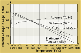 The gage factor is the strain sensitivity of the sensor. The manufacturer should always supply data on the temperature sensitivity of the gage factor. Figure 2-11 shows the variation in gage factors of the various strain gage materials as a function of operating temperature. Copper-nickel alloys such as Advance have gage factors that are relatively sensitive to operating temperature variations, making them the most popular choice for strain gage materials.